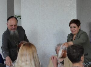 21 апреля 2025 года в рамках благотворительной акции «Подари радость ближнему», приуроченной к светлому празднику Пасхи, в гости к проживающим с теплыми поздравлениями, пасхальными куличами, тортом и яблоками приехали